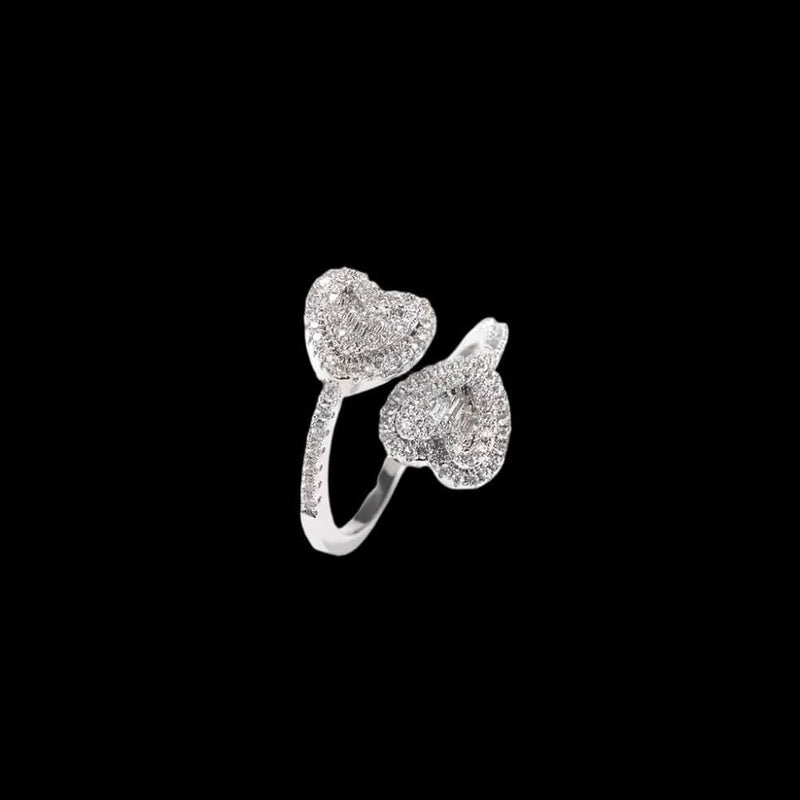 עיצוב מפוסל של שני לבבות המשובצים באבני באגט ואבני CZ5A, בציפוי זהב לבן מבריק שמאיר את הנוכחות שלך בכל תנועה.