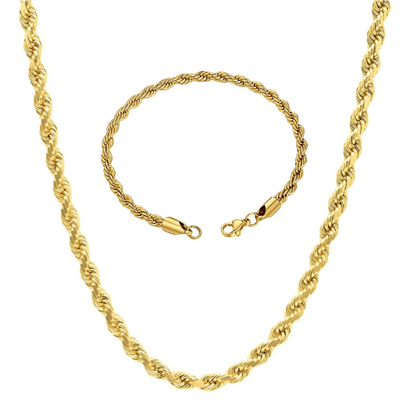 שפר את הסטייל שלך עם סט תכשיטים לגבר מסוג חבלים בצבע זהב, הסט כולל שרשרת חבלים שהיא השרשרת הכי אלגנטית וקלאסית שלנו וצמיד חבלים יוקרתי ואלגנטי | השרשרת והצמיד עשויים ציפוי זהב איכותי ועמיד ביותר. הסט עמיד במים. הסט עוצב לגברים אך יכול להתאים גם לנשים עם סטייל!