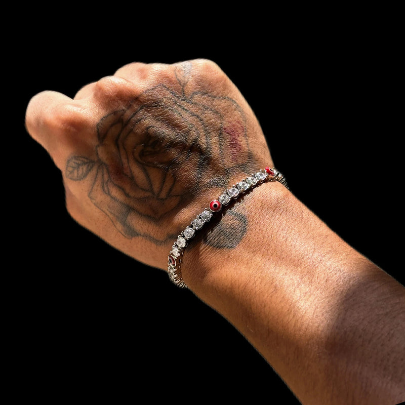טניס עין אדומה הינה צמיד אשר יבליט את העונד/ת שלו משאר האנשים בסביבה. בעל משבצות בחיתוך יהלום עם שיבוץ במידה אחידה ועיניים אדומות נגד עין הרע.
