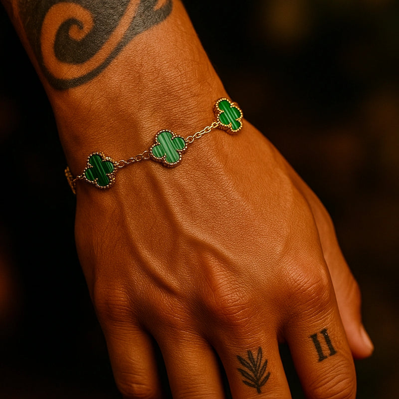 צמיד תלתן ירוק מבית דרייס הוא לא עוד תכשיט הוא הצהרת נוכחות. הציפוי בזהב 18K מעניק לו ברק עמוק ומרשים, והתלתנים המשובצים באבני מלכיט טבעיות מוסיפים לו אנרגיה ירוקה של שפע, ביטחון ומזל.