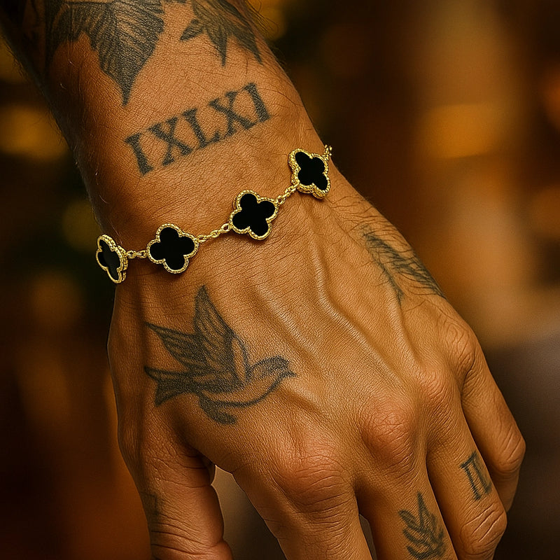 תכירו את הצמיד שלא רק משלים לוק הוא מגדיר נוכחות. צמיד תלתן בציפוי זהב 18K עם תלתנים שחורים יוקרתיים, עיצוב מושלם שמשלב בין יוקרה לאלגנטיות גברית מדויקת.