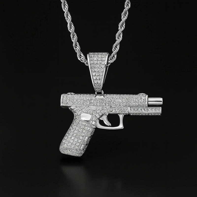 השרשרת אייס אקדח זהב לבן היא תכשיט שמביא עוצמה ונוכחות אמיתית. כל תליון נחתך בדיוק מושלם ומצופה בשלוש שכבות זהב לבן 18K, עם שיבוץ אבני זרקון (CZ5A) איכותיות בעבודת יד אחת־אחת, ליצירת ברק חד ועמוק שלא ניתן לפספס.