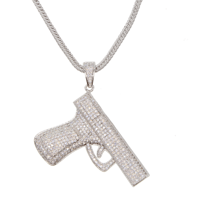 שפר את הסטייל שלך עם שרשרת אקדח היוקרתית בצבע כסף שלנו, שרשרת אקדח הינה השרשרת הכי יוקרתית שלנו | עשויה ציפוי זהב לבן ומשובצת באבני חן (זרקון) הנוצצים ביותר. אבני החן שובצו בעבודת יד על השרשרת על מנת לתת לכם את רמת הגימור הגבוהה הגבוהה ביותר..